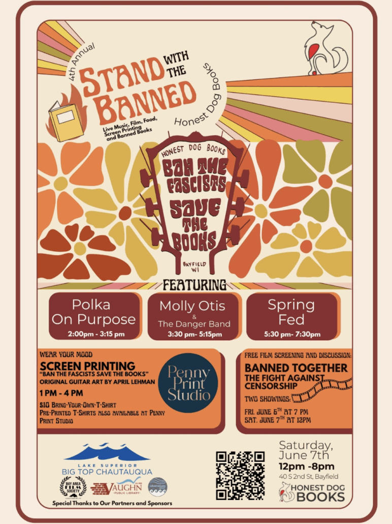 Penny Print Studio will be screen printing original art with Ban the Fascists, Save the Books on your tees. $10 fee. One (1) t-shirt per customer. Penny Print will also have T-shirts available for sale for screen printing or get your Honest Dog Books tee and print it on the back.
